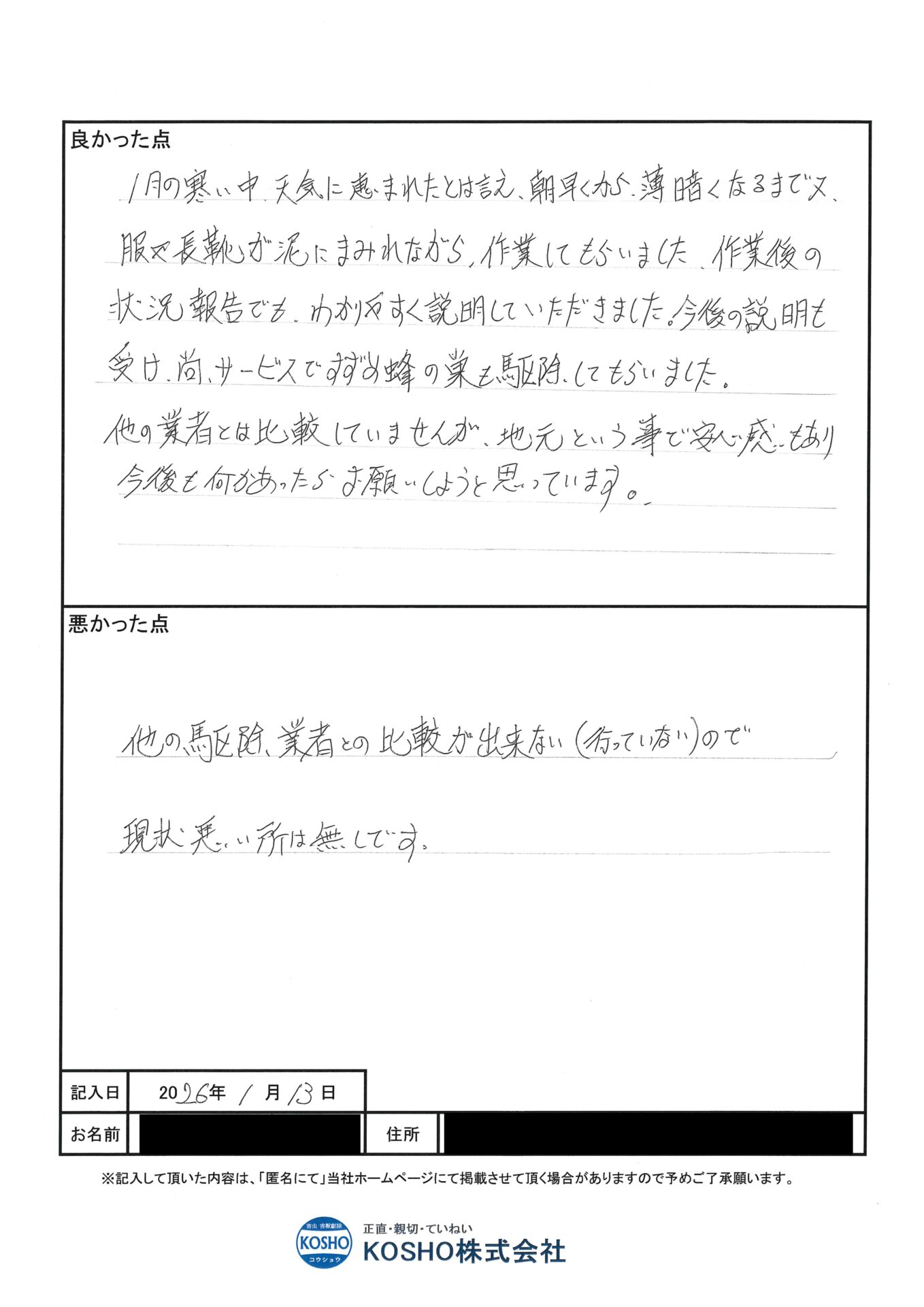 他の駆除業者との比較が出来ない(行っていない)ので、現状悪い所は無しです。