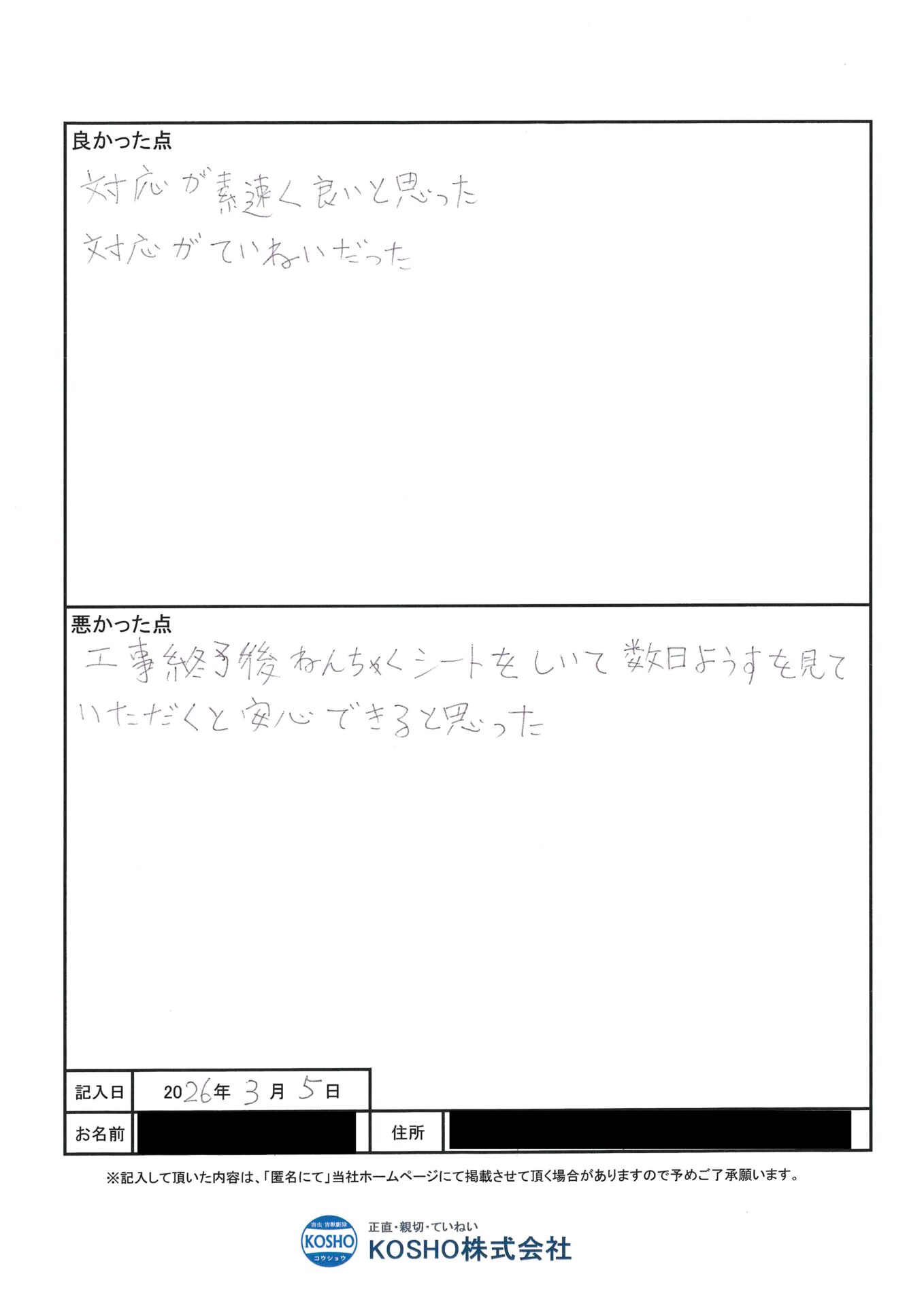 工事終了後、ねんちゃくシートをしいて、数日ようすを見ていただくと安心できると思った