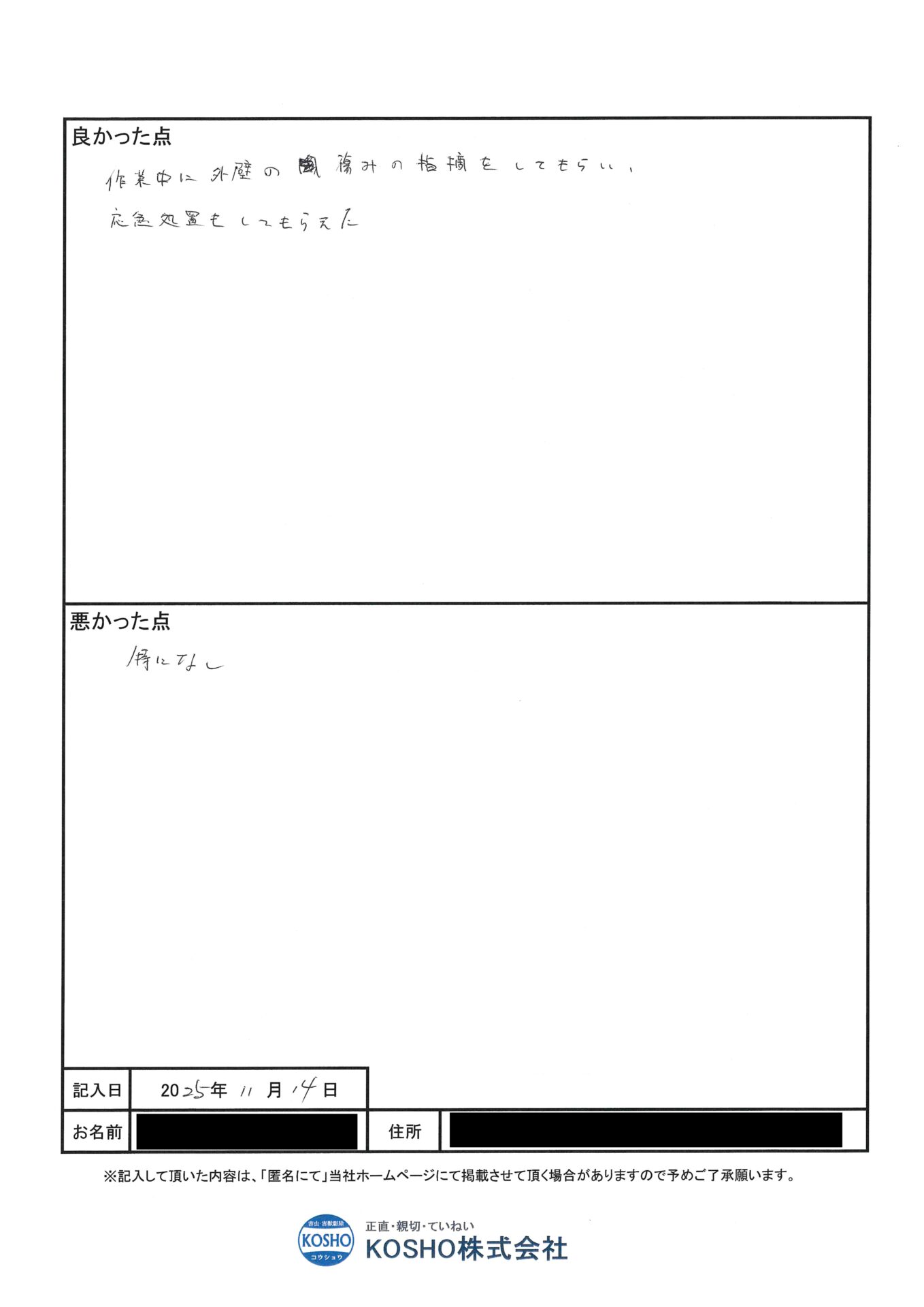 | 施工時の対応 | ★★★★ 大変良い |