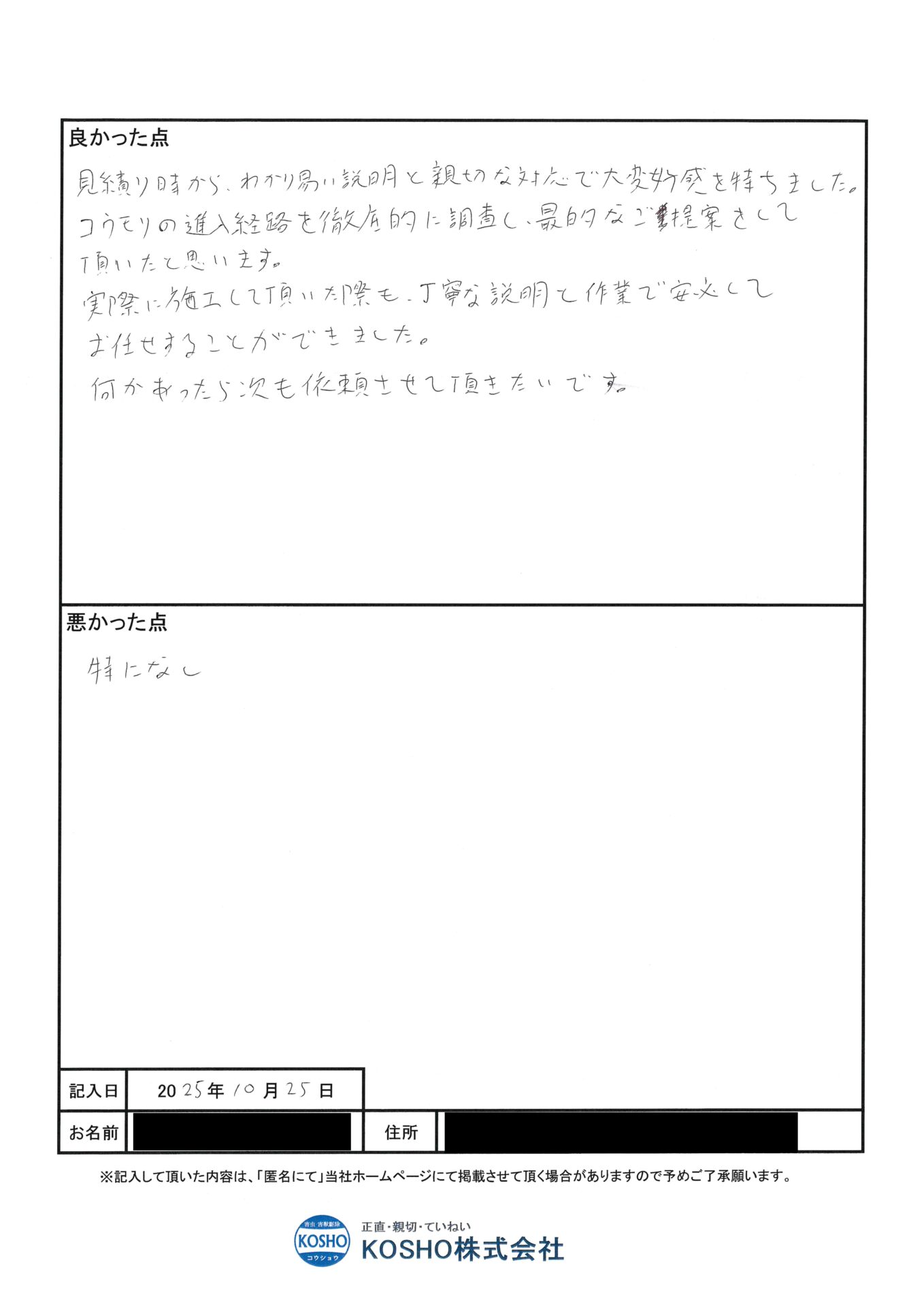見積もり時から、わかり易い説明と親切な対応で大変好感を持ちました。